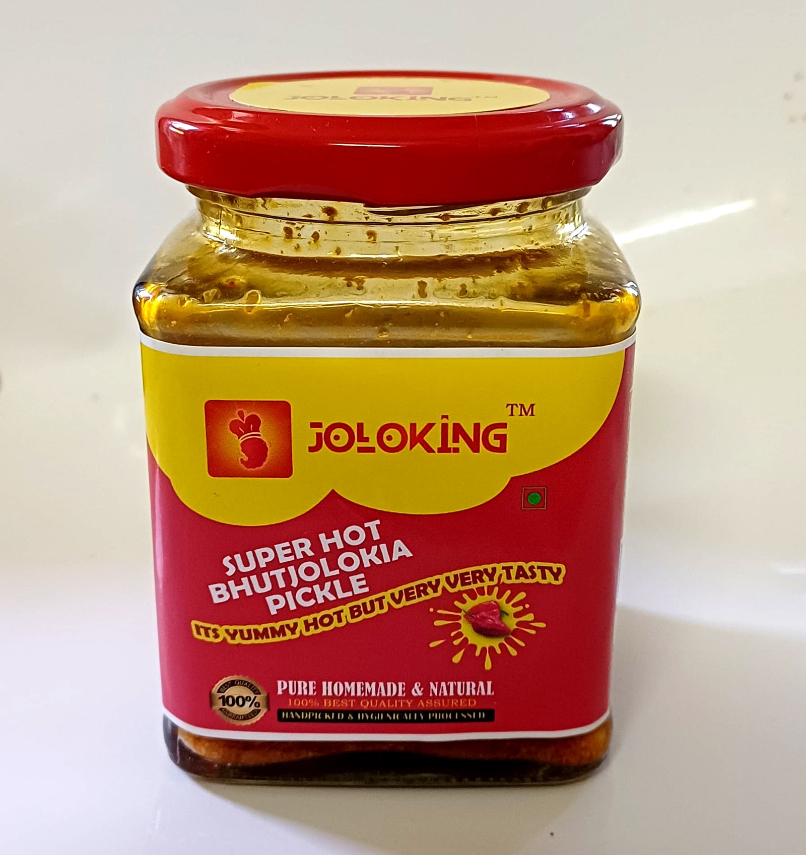 Joloking Superhot Bhut Jolokia Pickle mixed with kacchi ghani mustard oil and special spices. Its processed in a traditional hygienic homemade style and packed in a high quality food grade glass bottle to preserve its taste forever.